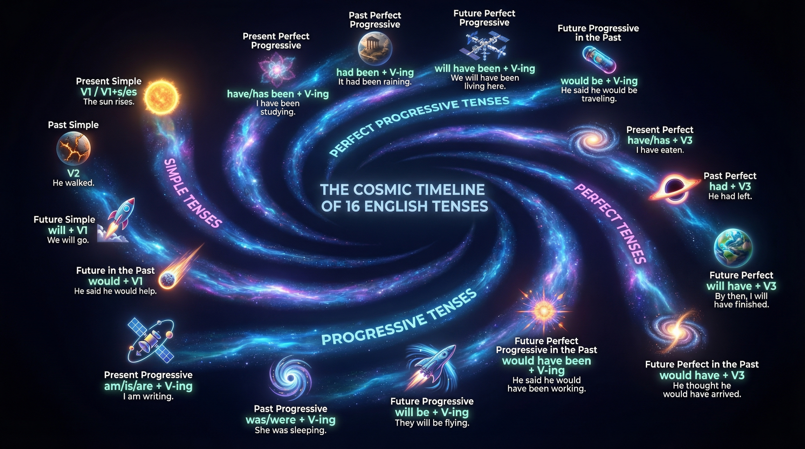 Mari kita bedah satu per satu 16 macam tenses ini, yang dibagi menjadi empat kategori besar berdasarkan garis waktunya.